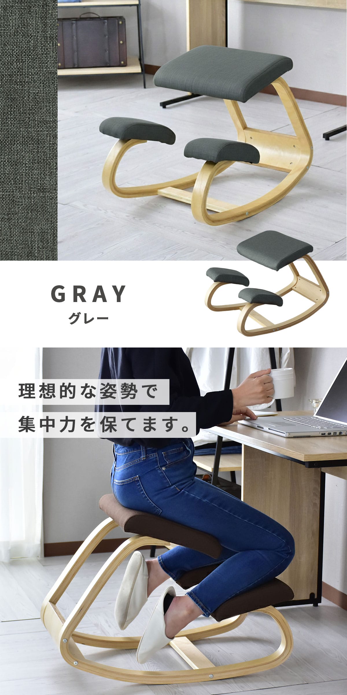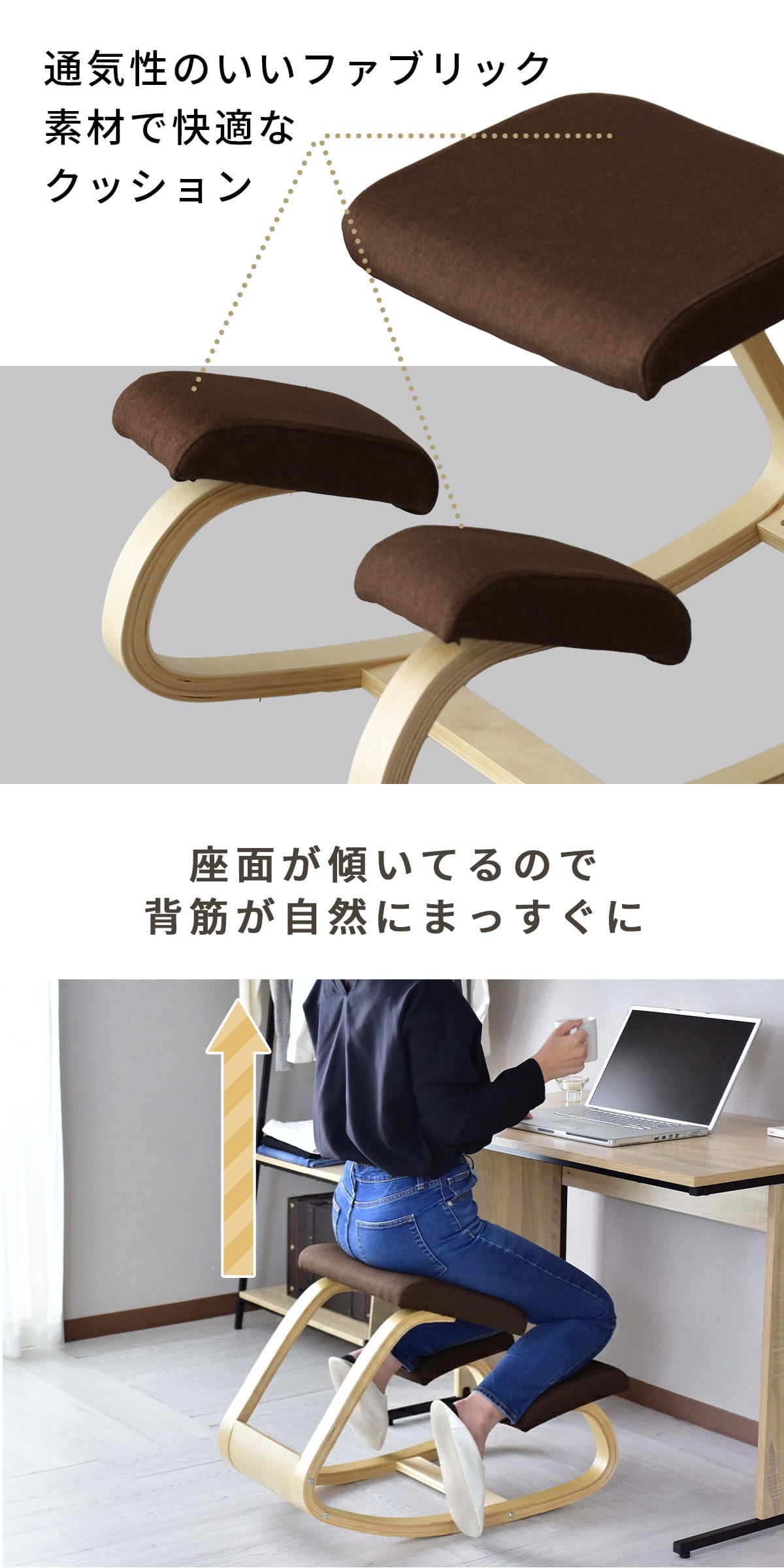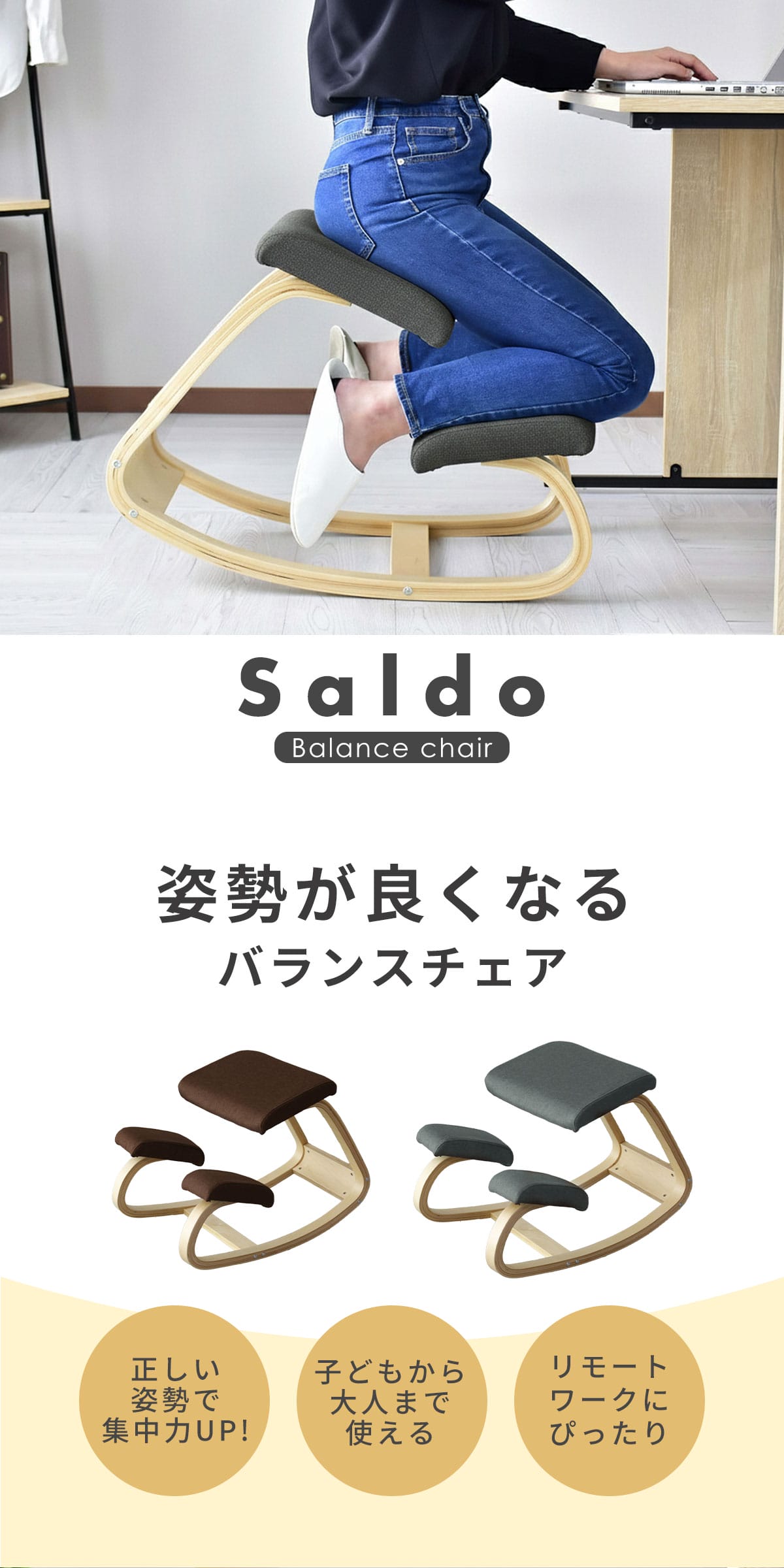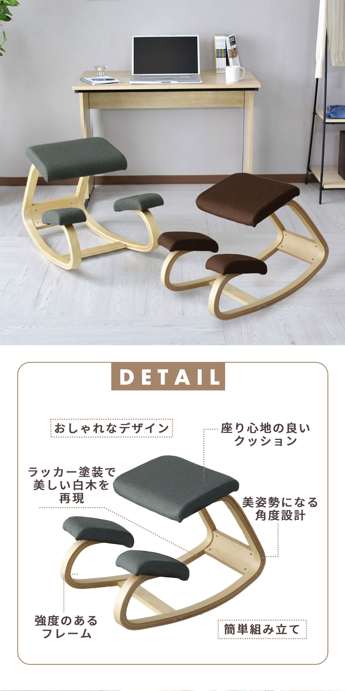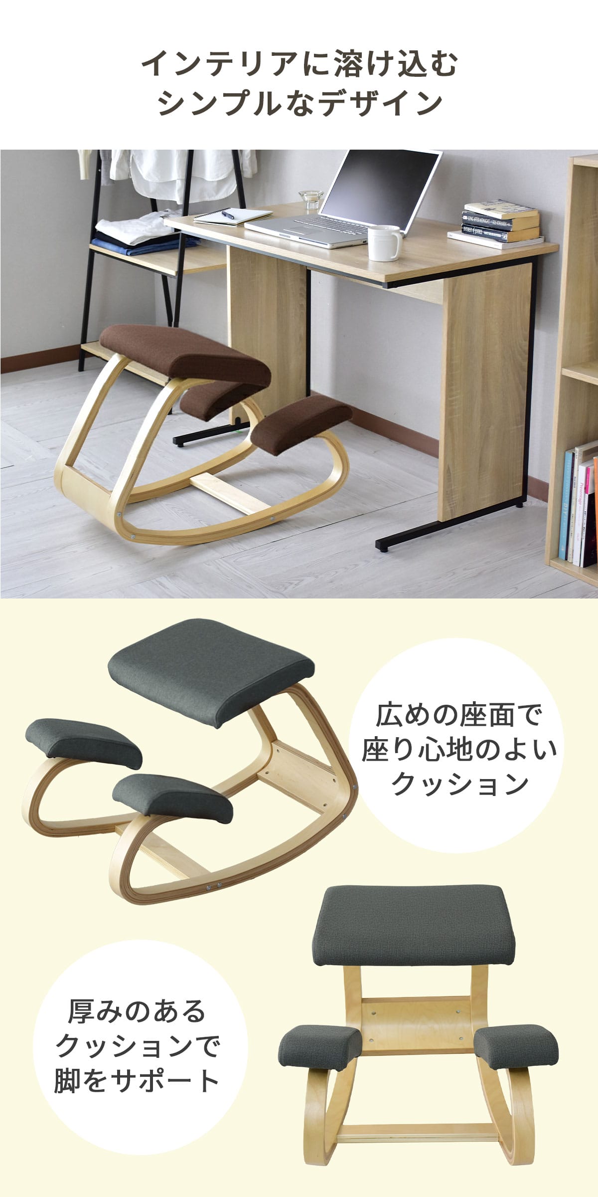 理想的な姿勢を保ちやすく、集中力アップをサポートする実用性の高いバランスチェア。座面と膝あてが身体をしっかり支え、快適な座り心地をキープします。学習、仕事、読書などさまざまなシーンで活躍し、置くだけで空間を引き締めます。
