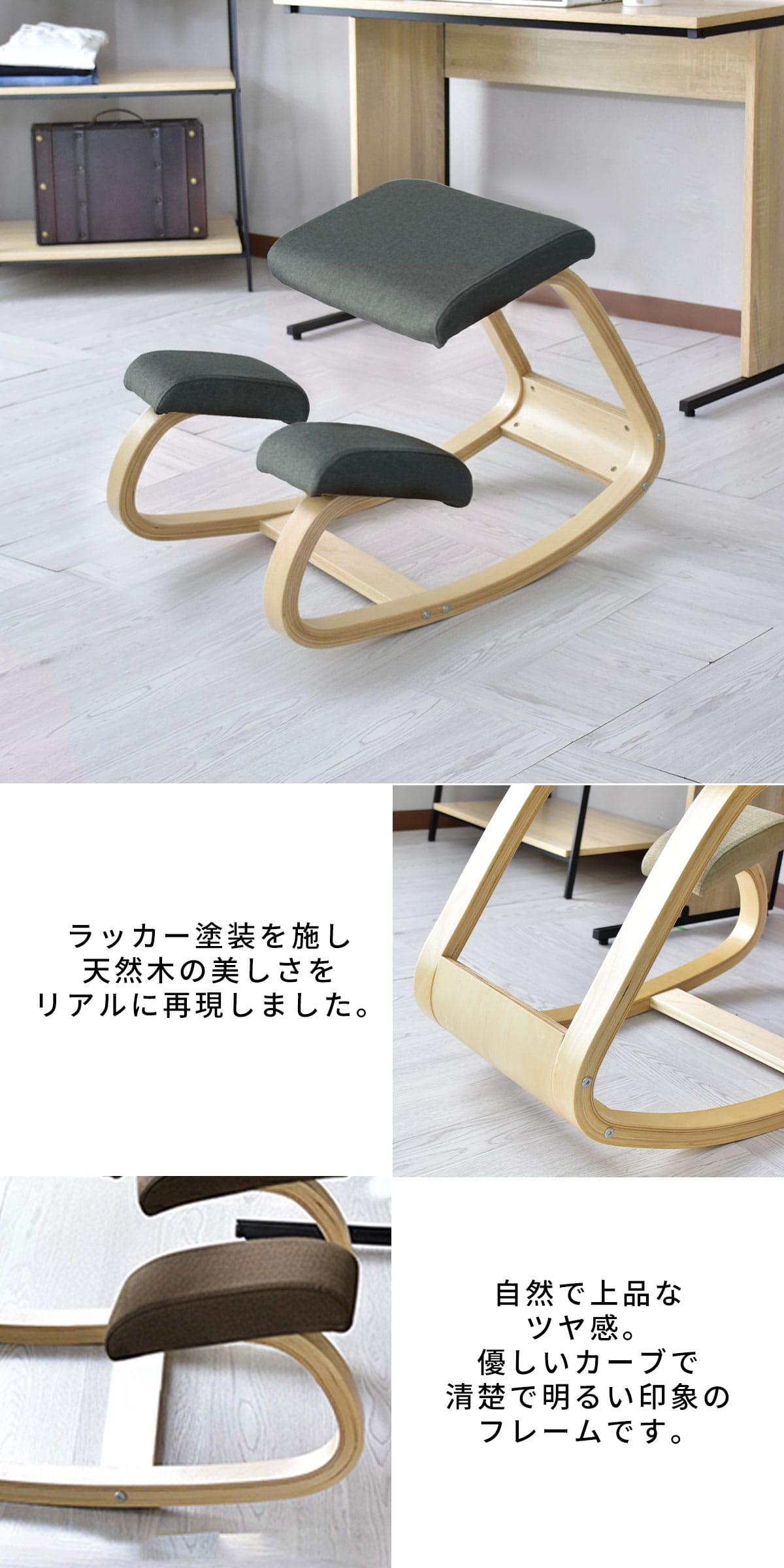 姿勢がよくなるよう計算された角度設計を採用したバランスチェア。背すじが自然と伸び、長時間座っても身体への負担を軽減します。天然木のような質感を再現したラッカー塗装と、シンプルで洗練されたデザインが特長。学習デスクからリビングまで、幅広い空間に馴染みます。