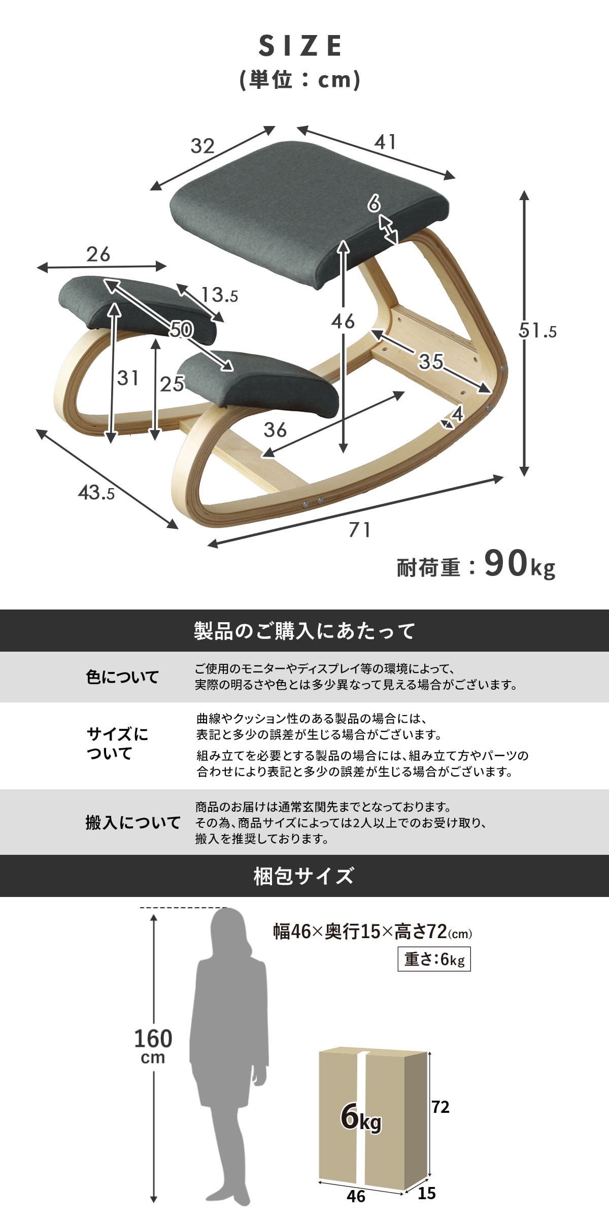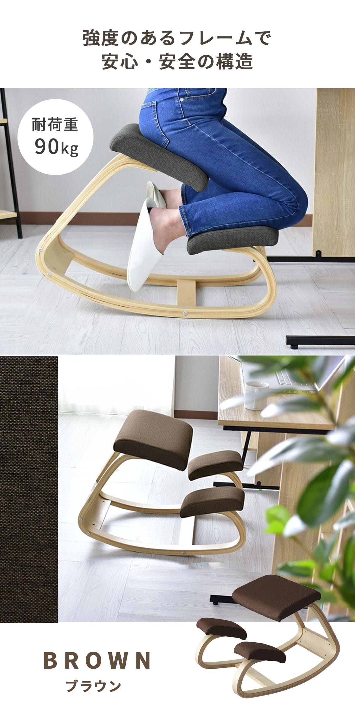 座面と膝あてには通気性の良いファブリックを使用し、蒸れにくく快適な座り心地を実現。厚みのあるクッションが体圧を分散し、長時間の勉強や在宅ワークでも疲れにくい設計です。前傾した座面が骨盤を立たせ、正しい姿勢へ自然に導きます。耐荷重90kgの安心設計で、大人から子どもまで幅広くご利用いただけます。