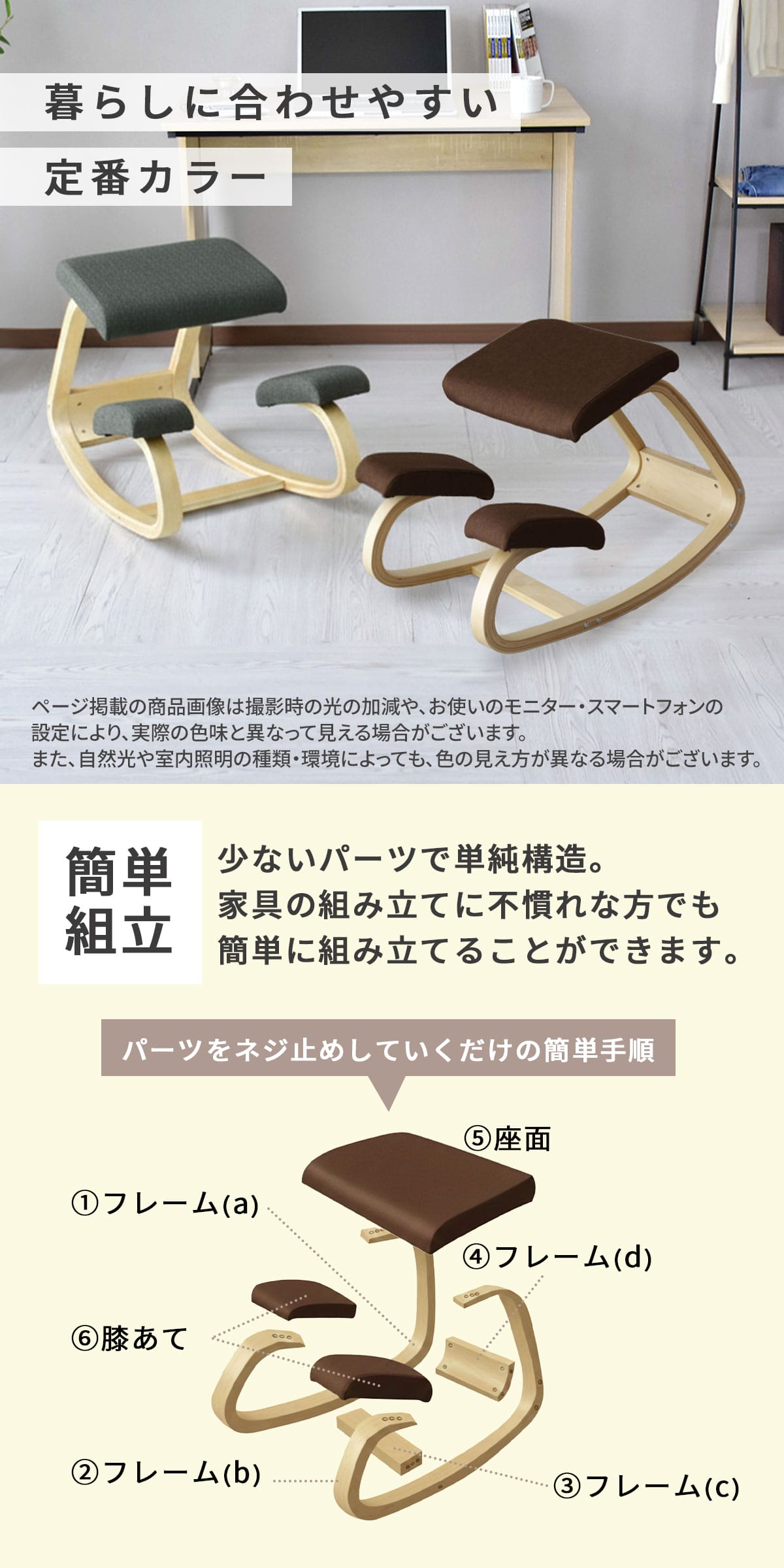 カラーはブラウンとグレーの2色展開。落ち着いた雰囲気のファブリックと白木調フレームの組み合わせが、空間にやさしく馴染みます。ナチュラルからシンプルまで幅広いインテリアと相性がよく、学習デスクやリビングにも取り入れやすい扱いやすいカラーです。※ページ掲載の商品画像は撮影時の光の加減や、お使いのモニター・スマートフォンの設定により、実際の色味と異なって見える場合がございます。また、自然光や室内照明の種類・環境によっても、色の見え方が異なる場合がございます。あらかじめご了承ください。