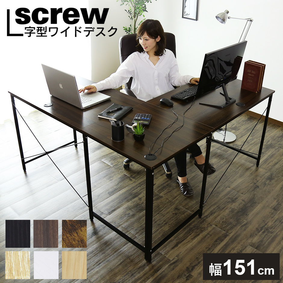 コーナーデスク screw【スクリュー】| 商品特徴| 作業がはかどる広々としたL字天板 | 作業スペースを最大限に活用できるL字型設計が特徴。横幅151cmの広々とした天板で、パソコン・モニター・書類・プリンターなど、さまざまなアイテムを余裕を持って配置できます。仕事や勉強、ゲーミング環境の構築にもぴったりで、デスクワークの効率を大幅に向上させます。 L字型デスクのメリットは、作業エリアを分けて使えること。例えば、右側はPC作業、左側はノートや資料を広げるスペースとして使うことで、スムーズに作業を進められます。また、デスクを部屋の角に配置することで、スペースを有効活用できるのもポイント。在宅ワークやリモートワークにも最適なデザインです。 |