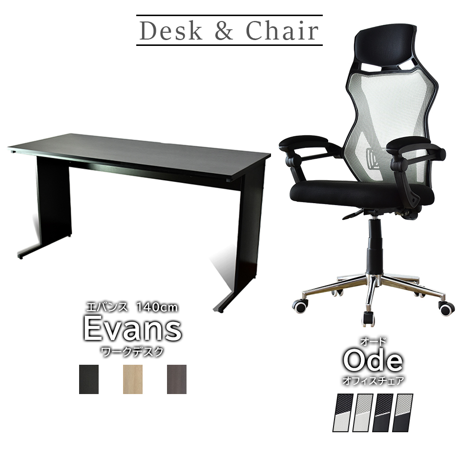 パソコンデスク オフィスチェア セット デスク チェア テレワーク 木製 PC メッシュ リクライニング 肘付き ハイバック 低反発 エバンス140cm オード4色
