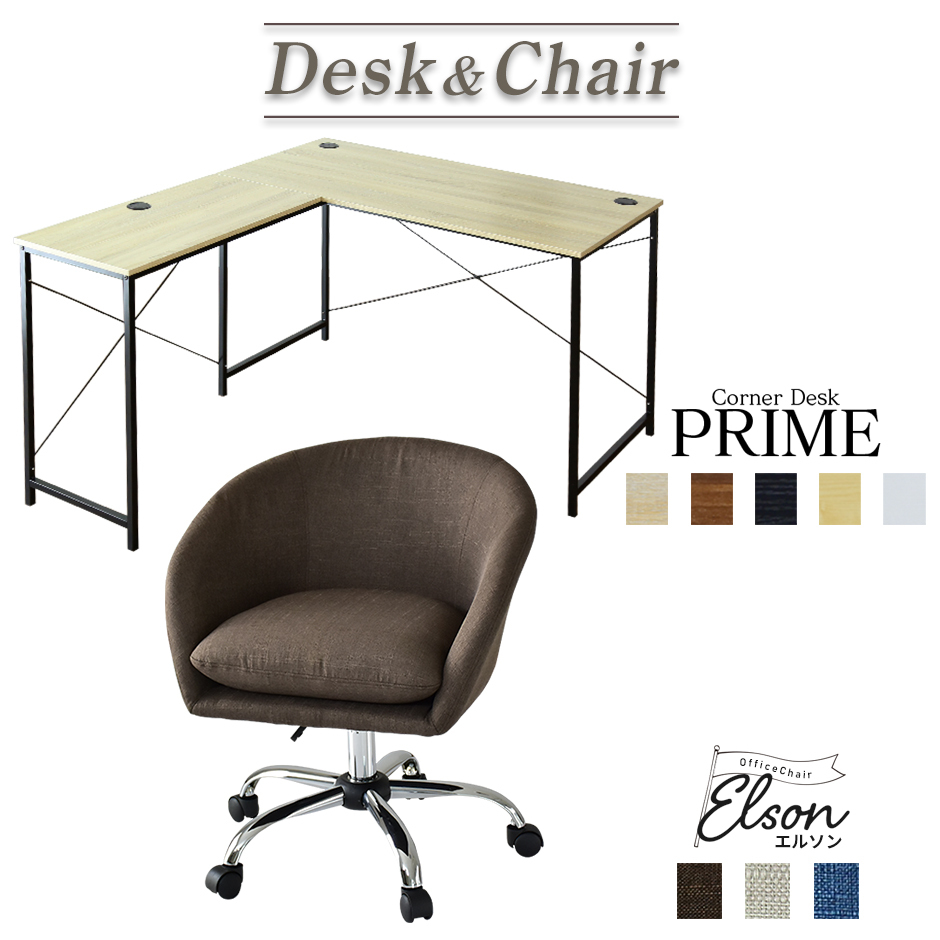 パソコンデスク デスク PCデスク L字型 コーナー 木製 オフィスデスク オフィスチェア 肘付き 360度回転 高さ調節 キャスター付き プライム エルソン
