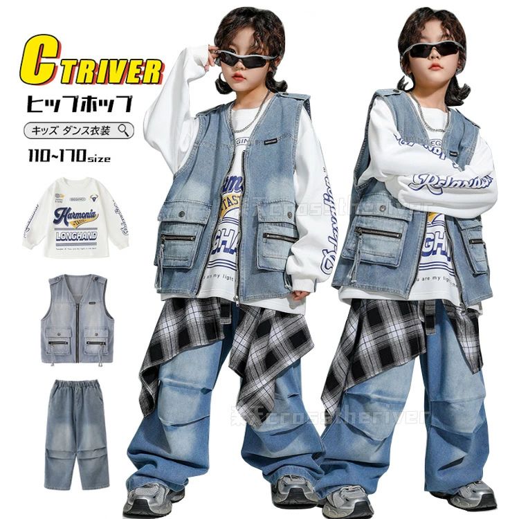 デニムパンツ キッズ ダンス 衣装 デニム セットアップ ベスト 長パンツ 青 ヒップホップ キッズダンス 子供服 カッコイイ 男の子 女の子 k-pop 衣装 韓国 練習