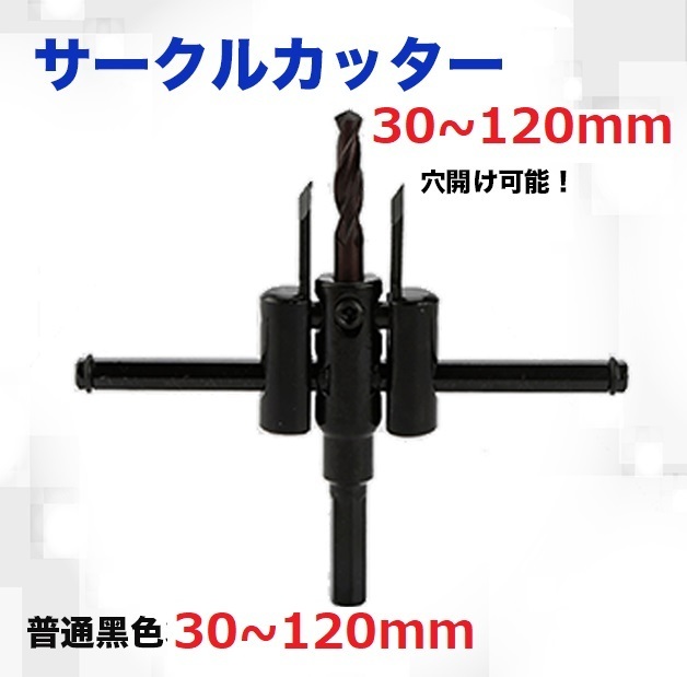 サークルカッター 30-120mm 穴あけ 穴開け 円切り カッター ホルソー フリー 自由に穴あけ 木工 石膏 穴あけ 配管 ダクト 自由錐 自在錐 ドリルドライバー★★★購入前に画像後半の配送に関する注意事項もお読みください(^-^★★★最大直径120mmまでのサイズで穴あけ加工が可能な、サークルカッター(自在錐/自由錐)です。先端のドリル、刃を変える用の六角レンチ付最大120mmまで自在に必要なサイズで開口!石膏ボード、ケイカル板、合板、スピーカーボックス、ドアノブなどの穴あけに!電動ドリルやボール盤等の電動切削工具に装着してご使用ください。30-120mm