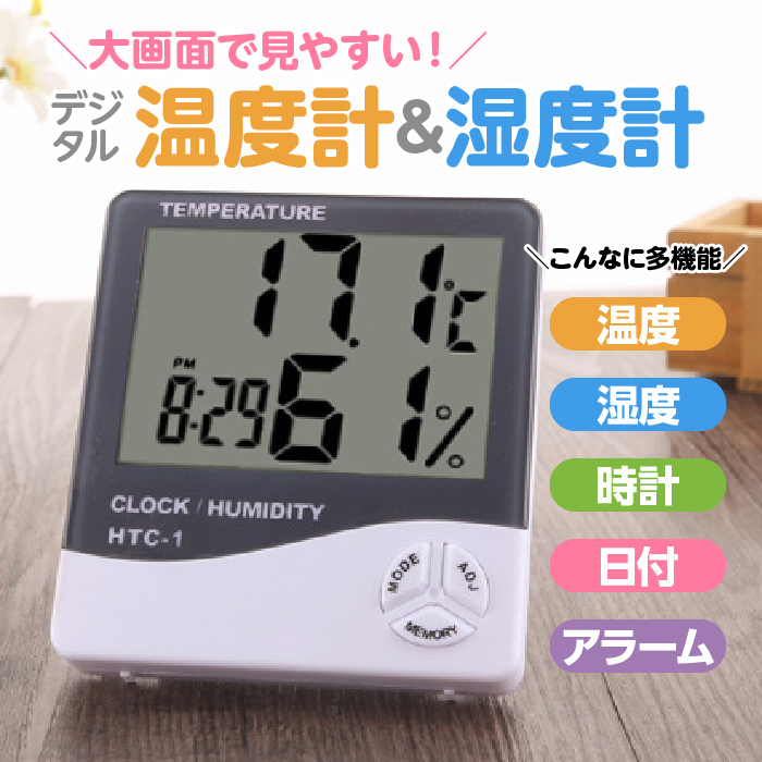 時計、温度、湿度、日付、アラームを表示するデジタル温湿度計です。