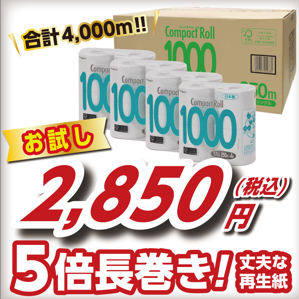 お試しSALE 5倍巻き シングル コンパクト トイレットペーパー 芯なし 250m 再生紙 無香料 長持ち 16ロール まとめ買い 業務用 節約 収納 丸富製紙 2858