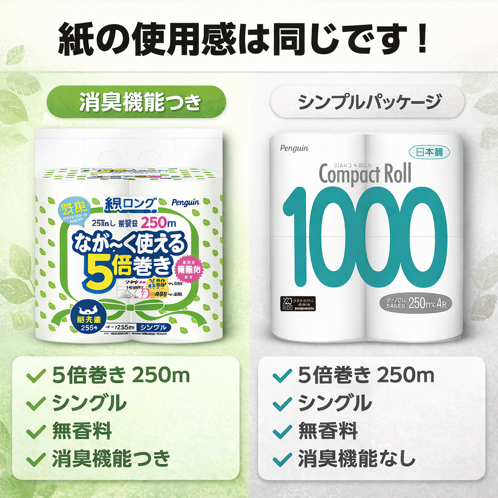 ※一般的な芯のあるトイレットペーパー(50mシングル)との比較