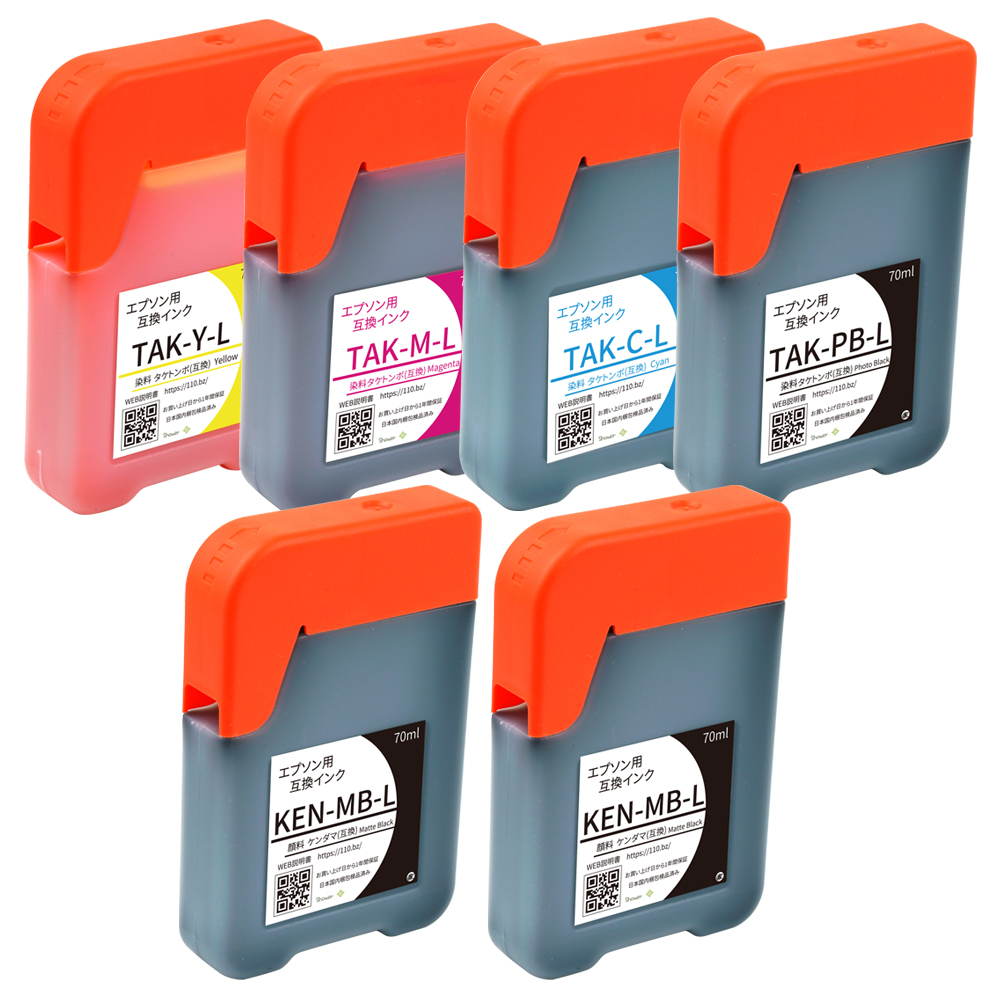 KEN-MB(顔料マットブラック×2)TAK-PB(フォトブラック×1)TAK-C(シアン×1)TAK-M(マゼンタ×1)TAK-Y(イエロー×1)