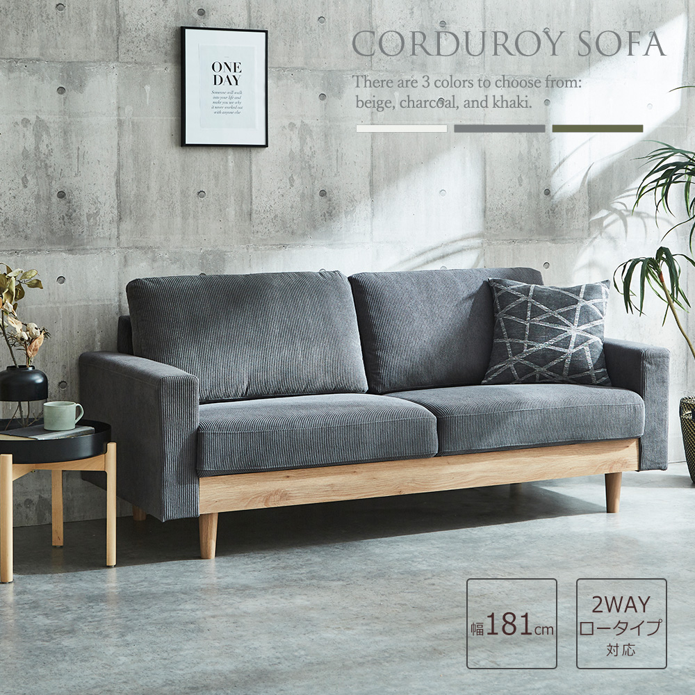 ソファ 3人掛け ローソファ 脚付き コーデュロイ ファブリック 木脚 ベージュ グレー グリーン おしゃれ リビング用