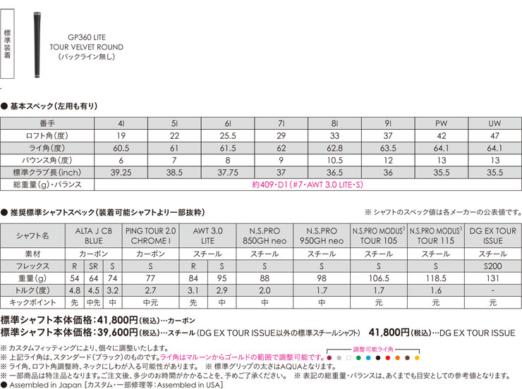 | 標準バランスご希望の場合は、メーカー推奨バランス(お任せ)になります。 標準長さをご指定の場合は、メーカー規定の長さになります ご希望のバランス・長さをご指定の場合は、バランスをコメント欄にご記入下さい。 ヘッド・シャフト重量により、お客様のご希望のスペックに添えない場合が御座います。 その際は、当方よりメールにてご連絡致します。 |