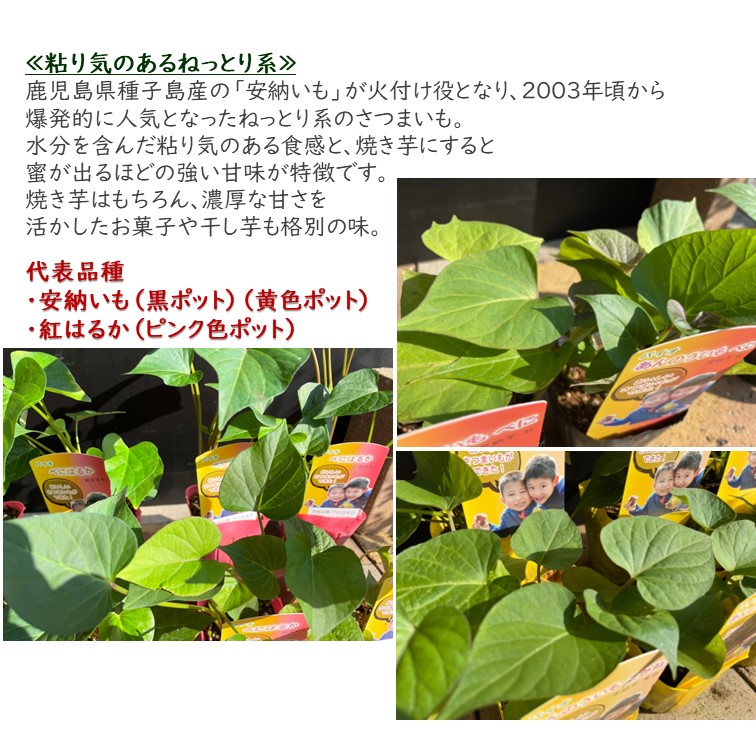 【安納芋・紅はるか】ねっとり 系のさつまいも。水分を含んだ粘り気のある食感と、焼き芋にすると蜜が出るほどの強い甘味が特 徴です。