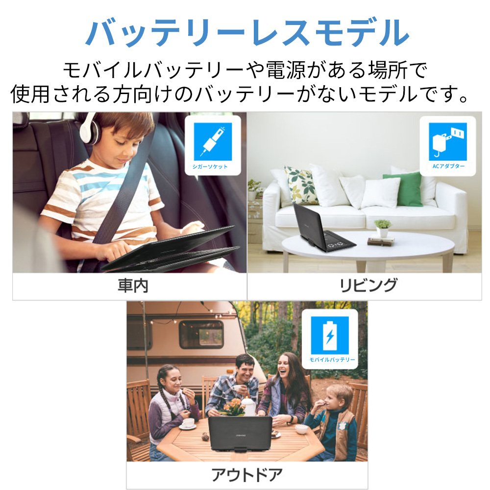 モバイルバッテリーや電源がある場所で使用される方向けのバッテリーがないモデルです。