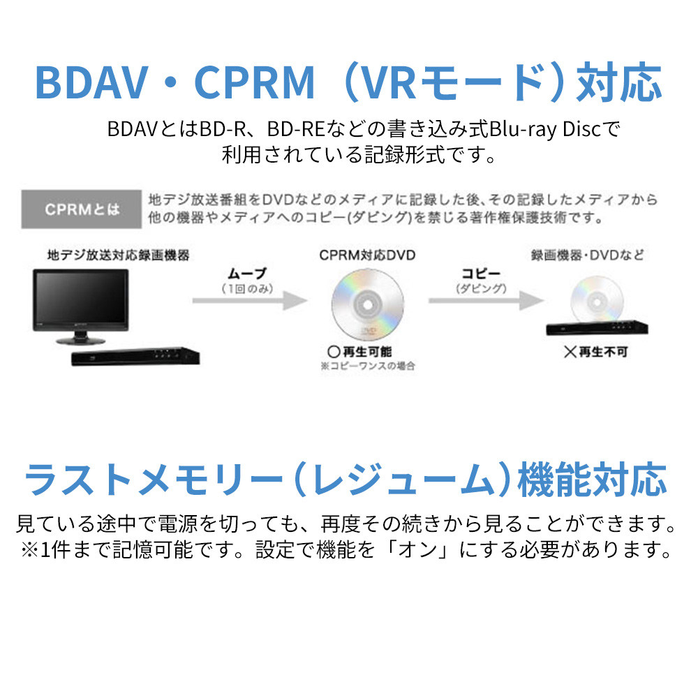 ●地デジを録画したブルーレイディスクやDVDも楽しめるBDAV・CPRM(VRモード)対応