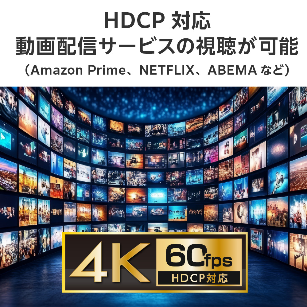 ・HDCP対応、動画配信サービスの視聴が可能(Amazon Prime、NETFLIX、ABEMAなど)