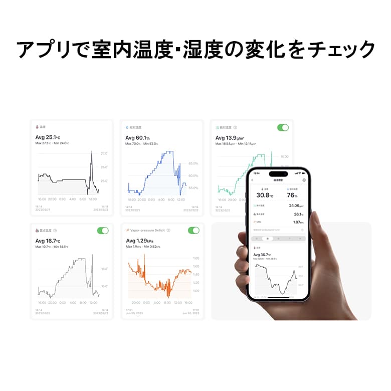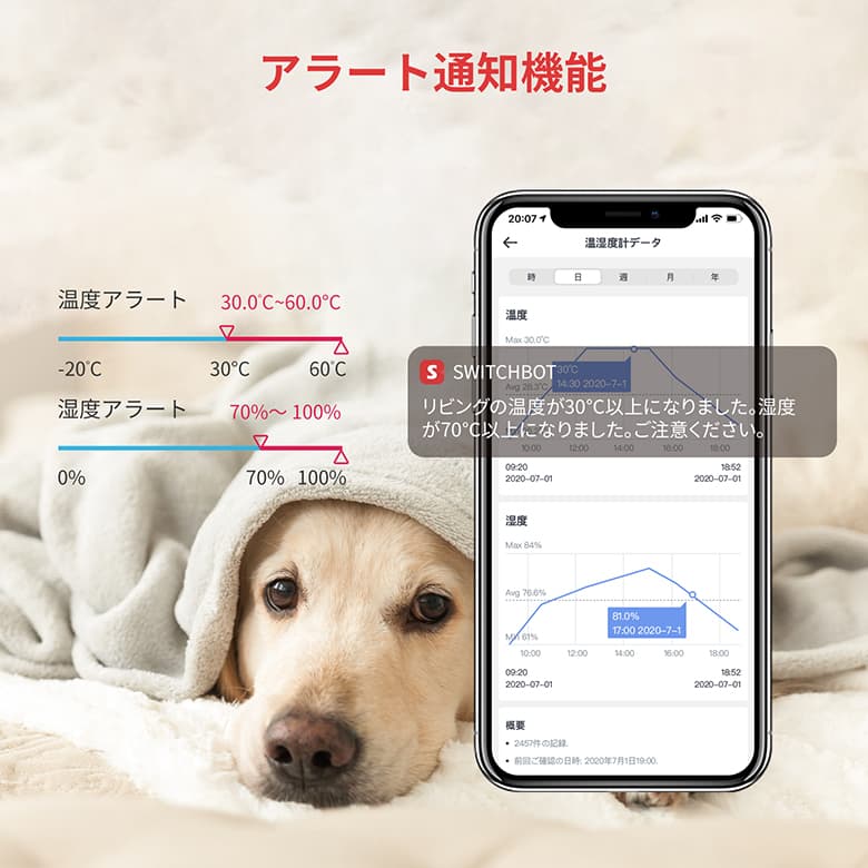 SwitchBot 温湿度計 適切管理 熱中症対策 乾燥対策 4WAY アラート通知 外出先 自動化 エアコン 加湿器 スマート家電 遠隔操作 照明 SWITCHBOTMETER-GH FOC