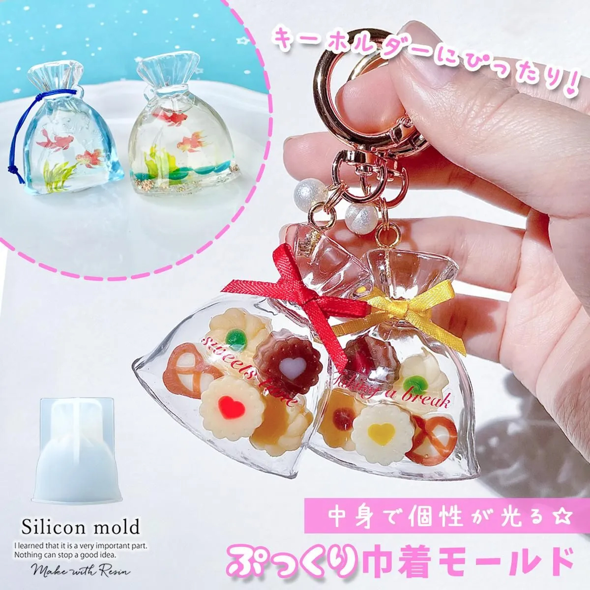 ぷっくり立体的な巾着袋が作れるモールド♪中に入れるモチーフで雰囲気ががらっと変わるよ。ドライフラワーや金魚モチーフなど、世界観を表す封入を閉じ込めてオブジェにしたり、中を空洞にしてスイーツパーツや液体を入れたり。あなたのアイデアを光らせて、かわいい作品を作ってね^^