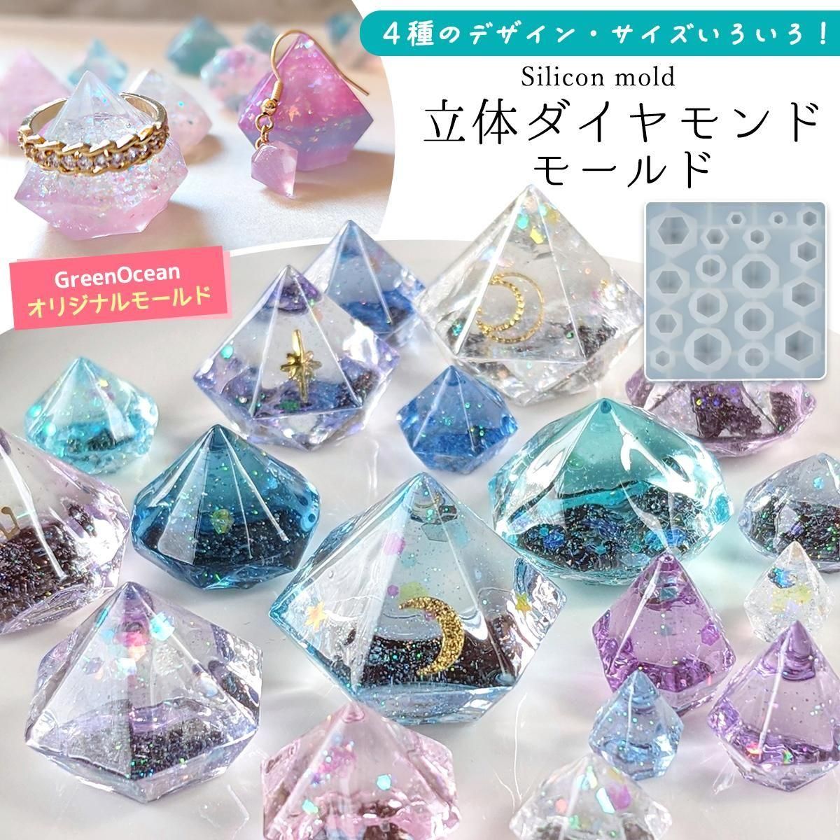 立体的で華やかなダイヤモンド型のパーツが簡単に作れちゃうよ。ダイヤモンドのデザインは4種類、小っちゃいのも大っきいのもサイズいろいろ。ヒートンと組み合わせるアレンジもかわいいよ^^