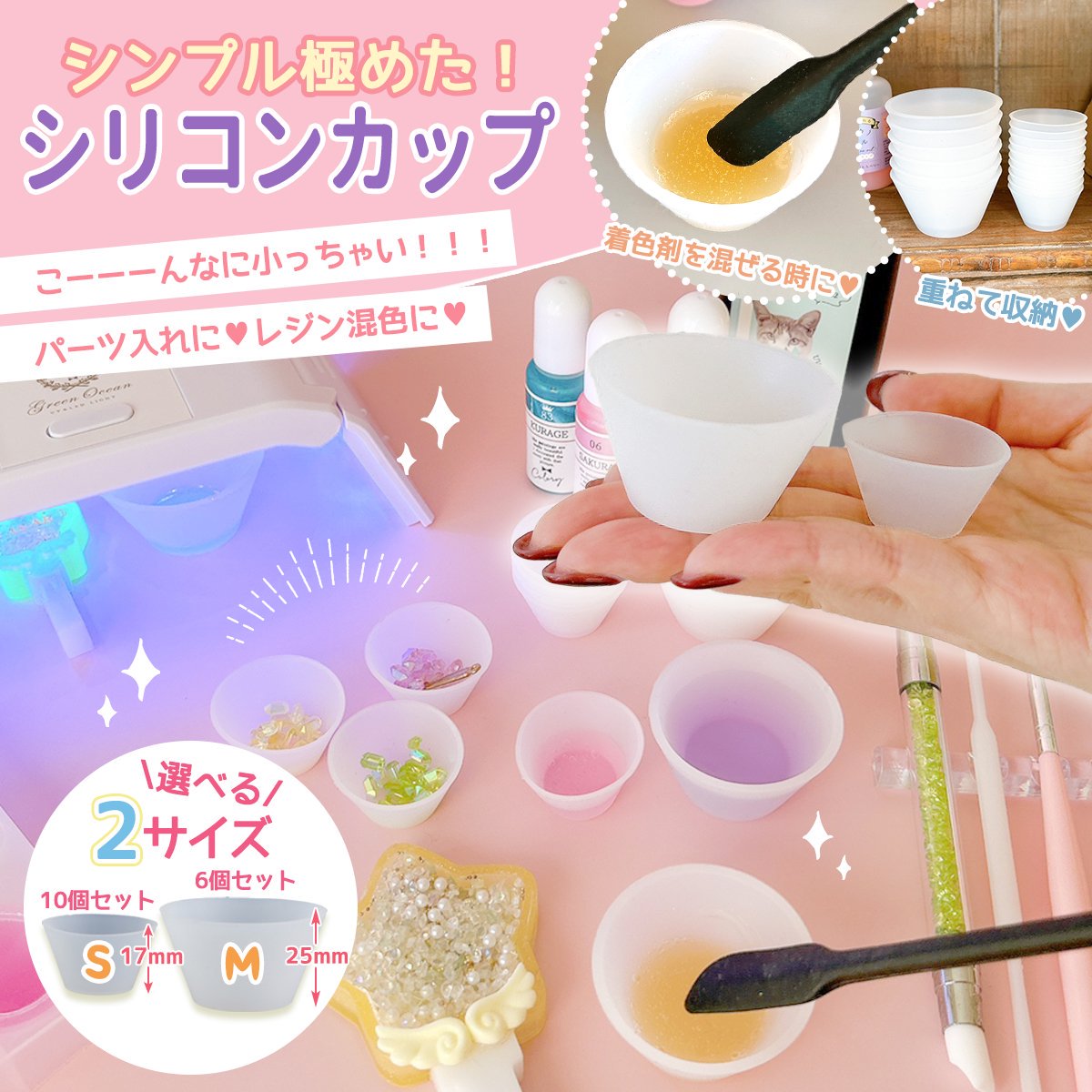 レジン液の着色、封入パーツの一時置きやミキシングなど、レジンクラフトで大活躍♪シンプルな形のシリコン素材の調色カップ。