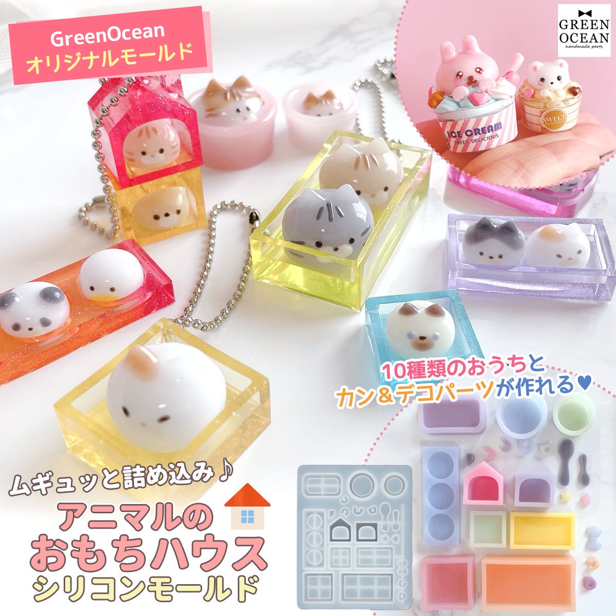 アニマルのおもち(型番:27650-G)にピッタリフィット♪むぎゅっと詰め込めちゃうお家やボックス、カップがいろいろ作れるシリコンモールド。GreenOceanオリジナルだよ♪