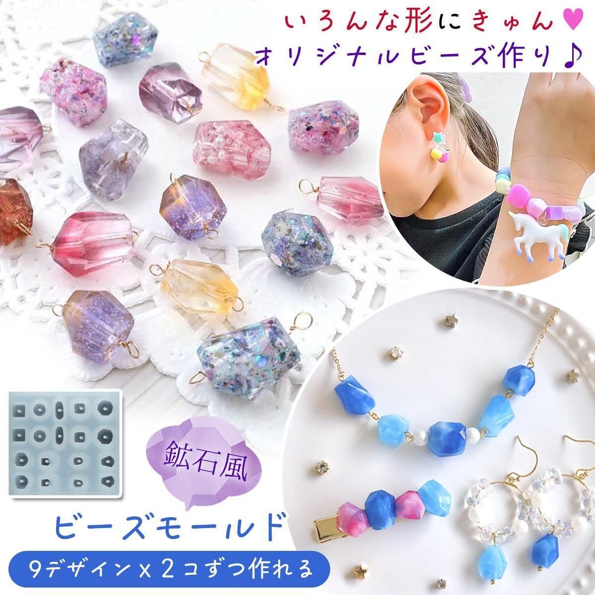 鉱石風の不揃いな形が魅力♪サイズも形も異なる9種類のオリジナルビーズが2個ずつペアで作れるシリコンモールド。通し穴は約1.4mm。お花やラメを入れたきれいめ作品にしたり、パステル調のゆめかわ作品にしたり、色んなアイテムを作ってみてね^^