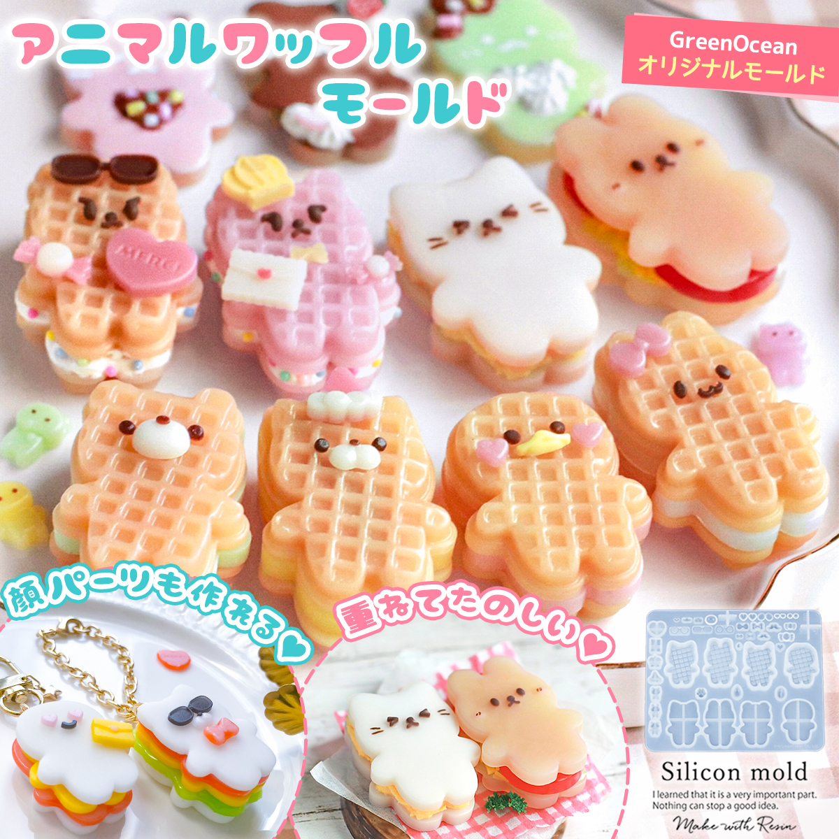 隠れ工房GreenOceanオリジナル♪可愛くて美味しそうなアニマル形ワッフルが一緒に作れちゃう、盛りだくさんなシリコンモールド。ネコ、ウサギ、くま、耳なしの4タイプがあるよ!