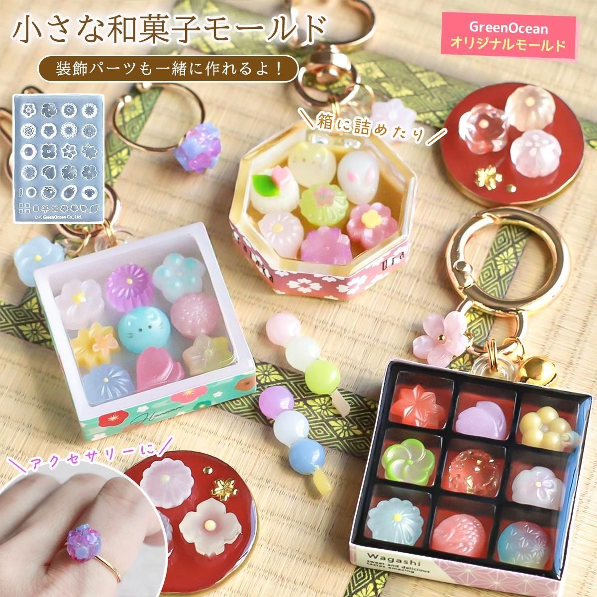 ミニサイズでも、和菓子の繊細なデザインまで表現できるよ。たくさんのモチーフに加えて、装飾パーツまで作れるのが嬉しい。9マスボックスや琥珀糖の箱に詰めてフタをしたり、単体のパーツだけでアクセサリーに仕立てるのも可愛い。組み合わせてアレンジを楽しんでね^^