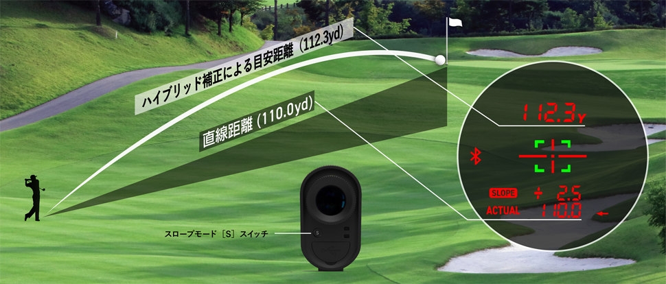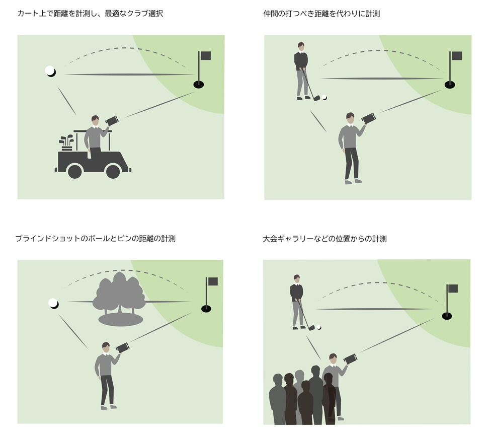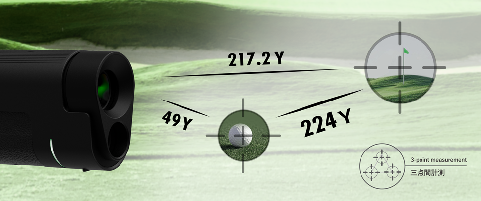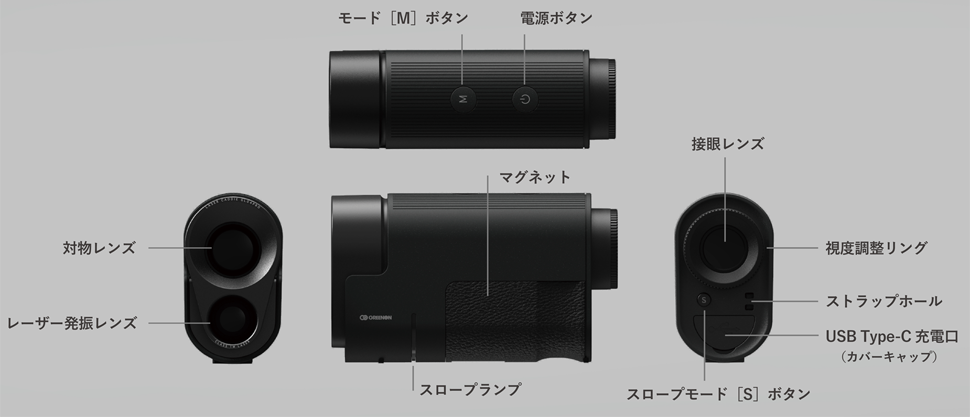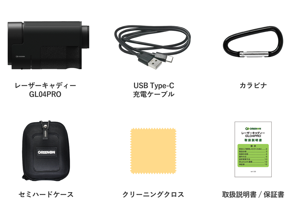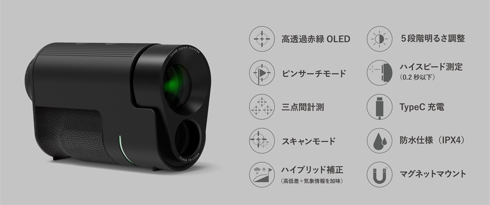 ![]() 高性能 × デザイン × 操作性。すべてを兼ね備えた「LASER CADDIE GL04PRO」 赤と緑の2色OLEDディスプレイを搭載し、視認性とデザイン性を両立。ピンサーチ、スキャンモード、3点間計測に加え、気象情報を加味したハイブリッド計測機能採用。 マグネットマウントにより、カートやバッグへの装着もスムーズで、快適な操作性を実現しました。 GL04PRO主な特徴 ![]() 人気の赤緑2カラーOLED採用 圧倒的な明るさ・見やすさで快適な測定が可能。 ![]() ピンサーチモード 複数のレーザー反射情報から最も近くの目標物情報を優先的に処理するモードです。 ピンより奥の目標物に照準を合わせ、電源ボタンを押しながらピンに合わせると、ロックアイコンが表示され、本体が振動し距離が固定されます。 ![]() スキャンモード 様々なターゲットまでの距離を連続でスキャン。複数の目標物に対して電源ボタンを押し続けると連続測定します。 ![]() ハイブリッドモード/スロープモード スロープ補正に加えて気象情報を加味したハイブリッド補正による打つべき目安距離を表示します。 ※GREENONアプリとペアリングしてBluetooth接続を行っていない場合は、高低差を加味した目安距離および直線距離のみが表示されます。 ![]() 3点間計測モード 離れた位置から ボールからピンまでの距離を計測できます。 ![]() こんなシーンで使えます。 ![]() NEW 連続計測 :自分と同伴者(複数も可) の打つべき距離を連続で計測 ![]() このように使います。 ![]() ![]() ![]() ![]() 防水仕様&充電方式 生活防水(IPX4)に対応しているため、突然の雨でも安心。さらに、USB Type-C 充電式バッテリーを採用しスピーディーで手軽な充電を実現。 ![]() マグネットマウント カートやクラブバッグにしっかり固定できるマグネットマウントを採用。出し入れの手間がなく、スムーズに使用可能。落下のリスクも軽減し、さらに快適なプレーをサポート。 ![]() 各部の名称 ![]() 製品仕様