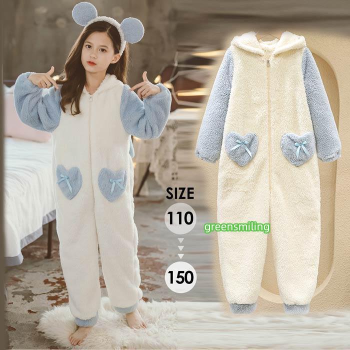 パジャマ 女の子 冬用 長袖 ルームウェア うさぎ耳付き 兎耳 キッズ オールインワンブルー ブルー×ホワイト オーバーオール 着ぐるみ 子供服 着る毛布 ジュニア ナイトウェア コーラルフリース 防寒 あったか 部屋着 寒さ対策 パープル ピンク 110/120/130/140/150 dh200c0c0x1