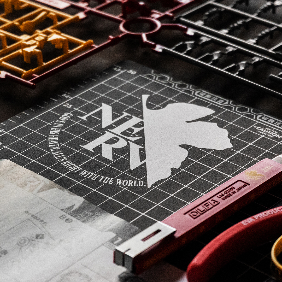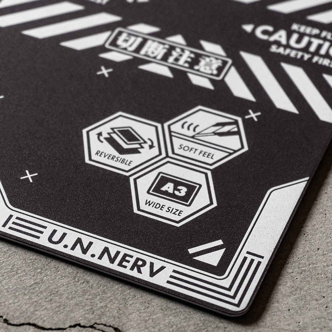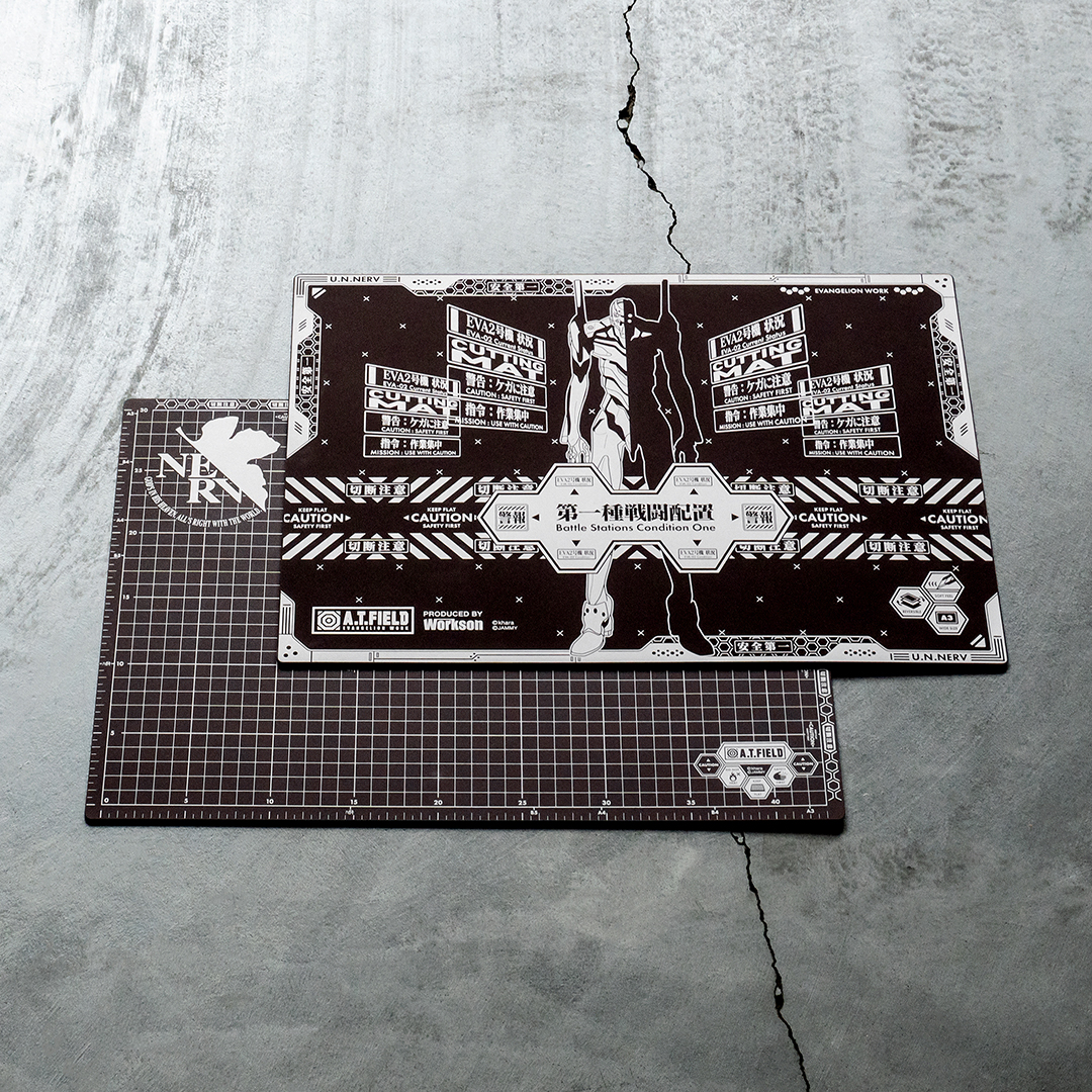 エヴァンゲリオンのワークブランド「A.T.FIELD EVANGELION WORK」と、カッターの国内トップメーカーであるオルファがコラボレーションした、劇中のモニターグラフィックスをイメージしたカッターマットです。注意表記などの表記をモニター画面のようにアレンジしたデザインです。A3より一回りゆとりのあるサイズや3層構造によるソフトな使い心地でカッティングをサポートします。