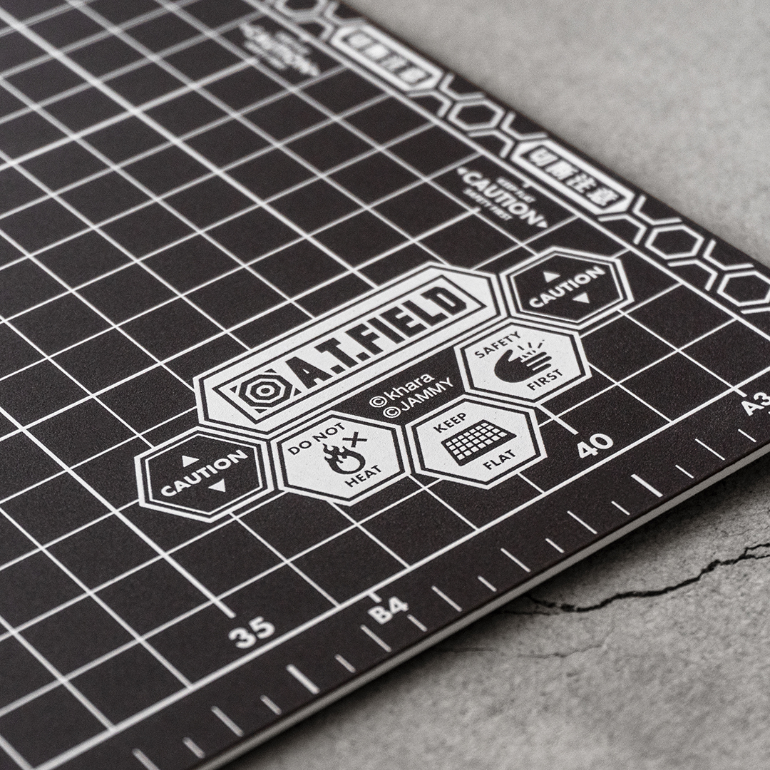 表面は10mm間隔のグリッドと5mm間隔のめもり、規定用紙サイズ(B5・A4・B4・A3・ハガキサイズ)の目安付き。注意事項などの表記をワークブランド「A.T.FIELD」らしくアレンジしつつも実用的なデザインです。