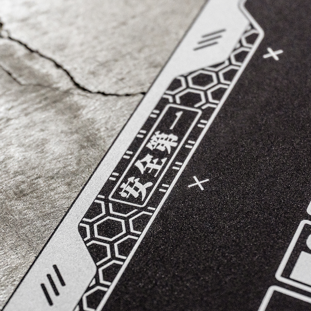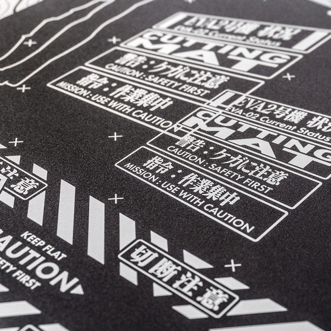 ■エヴァンゲリオンの世界観と実用的な表記を融合させた裏面デザイン裏面はエヴァンゲリオン2号機のイラストと、カッターマットの使用上の注意事項を劇中に登場する特徴的なモニターグラフィックスとして表現したデザインに、メカニカルな雰囲気のフレームを組み合わせて「A.T.FIELD」の世界観を表現しています。
