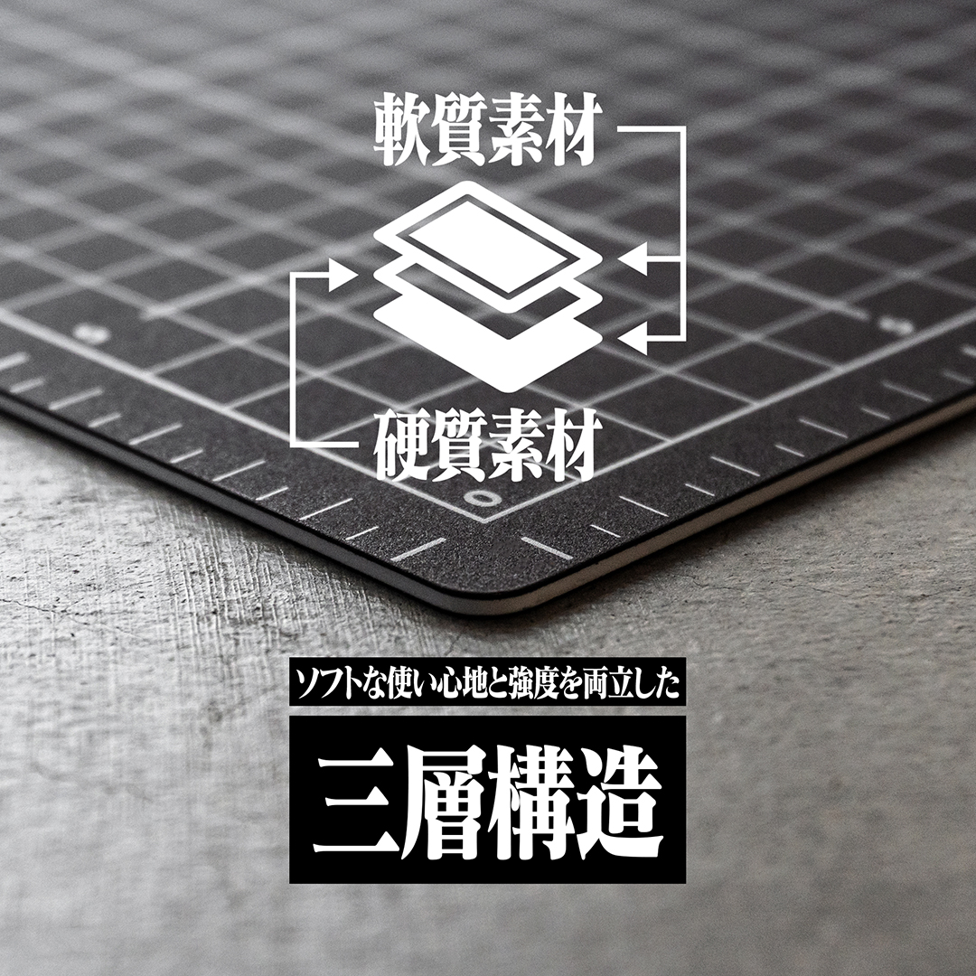 硬質素材を軟質素材ではさんだ三層構造なので表裏両面とも使えます。外側の軟質素材がソフトな刃当たりで快適なカッティングを実現。切り口が目立たず、カッターの刃の切れ味も長持ちします。また、中心の硬質素材によって強度も両立しています。