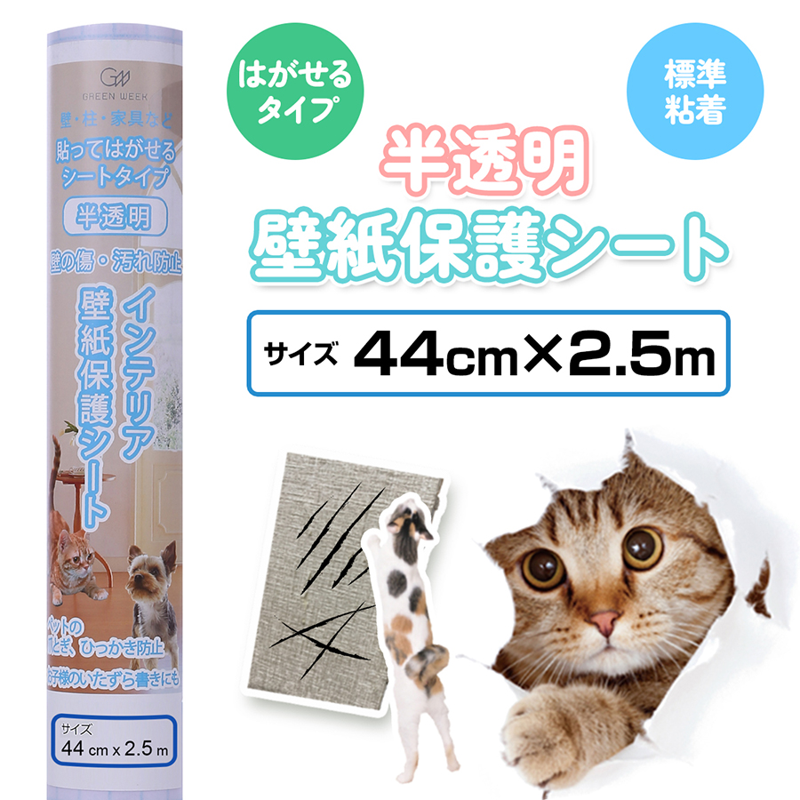 半透明 壁の傷(猫 爪とぎ)、汚れ防止 壁紙保護シート(はがせる粘着タイプ:標準) 44cm×2.5m