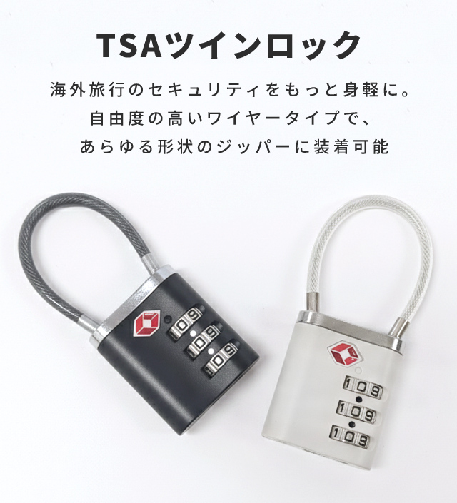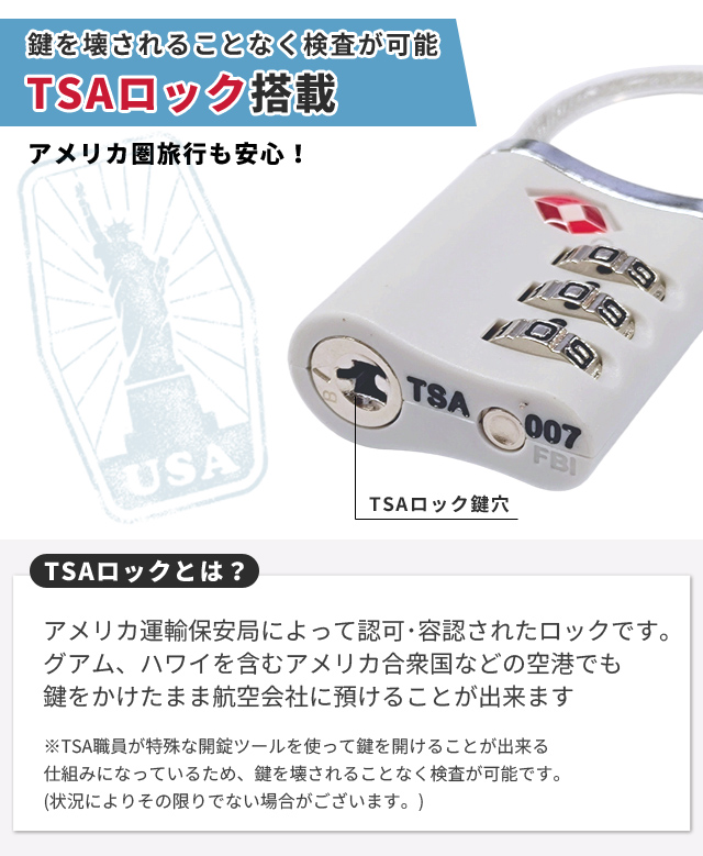 アメリカ圏旅行に欠かせないTSA認可モデル。施錠したまま荷物を預けることができ、空港職員による検査が必要な際も、鍵を壊されることなくスムーズな開錠が可能です。