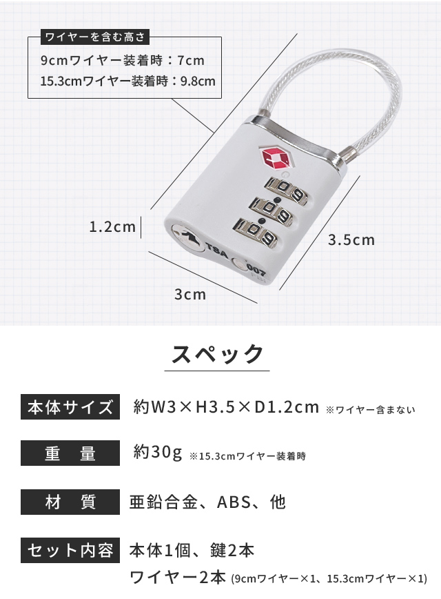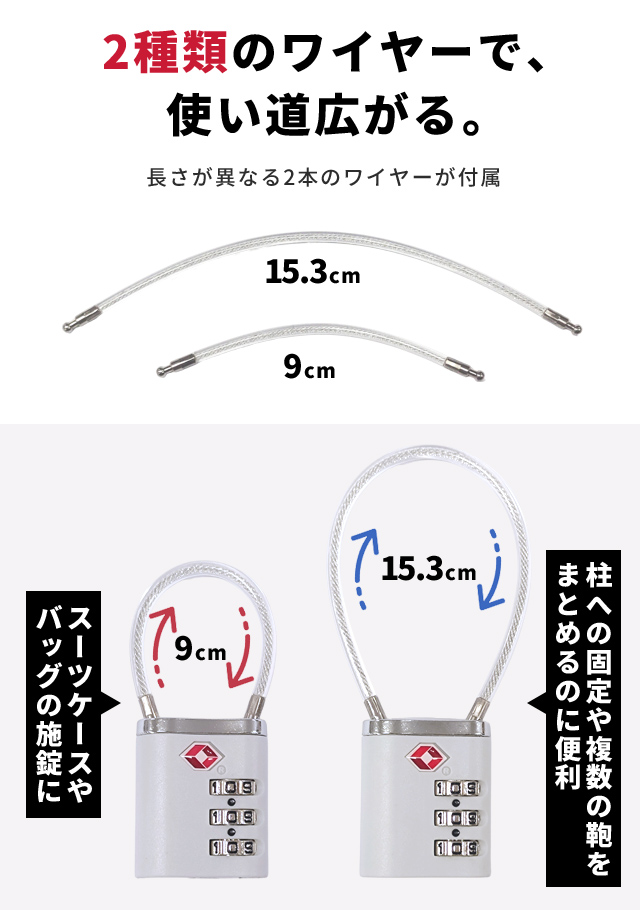 セット内容:本体1個、鍵2本、ワイヤー2本(9cmワイヤー×1、15.3cmワイヤー×1)