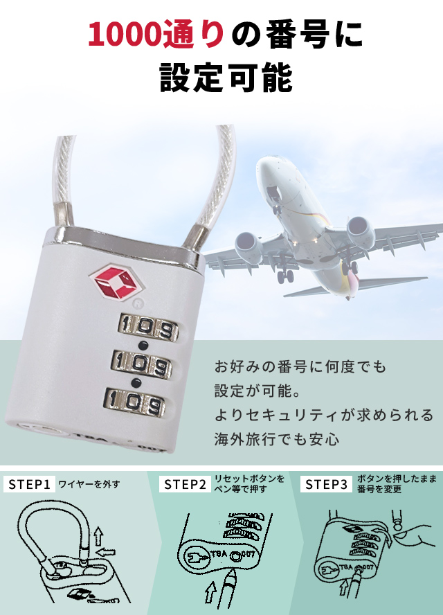 ツルの部分がワイヤーなので小さなファスナーの持ち手にも使える! *旅行用品/旅行便利グッズ/海外旅行グッズ/旅行小物/防犯グッズ/防犯用品/セキュリティ用品/セキュリティグッズ/盗難防止/盗難対策/アメリカ旅行/ハワイ/グアム/サイパン/TSAタイプ/TSA付き/TSA式/鍵式/鍵/カギ/番号不要/ダイアル/ダイヤル式/ダイヤルタイプ/ダイヤル錠/ダイヤルタイプ/3桁ダイヤル/3桁/3ケタ/施錠/ケーブル/ワイヤー付き/錠前/学生旅行/修学旅行/ロッカー/ポスト/スーツケース/キャリーケース/キャリーバッグ/キャリーバック/リュックサック/ザック/アタッシュケース/屋外/宅配ボックス/旅行かばん/旅行鞄/カメラバッグ/貴重品/テント/キャンプ/学校/シルバー/ブラック/黒/あると便利/おしゃれ/丈夫/ジム/フィットネス/2WAY開錠*