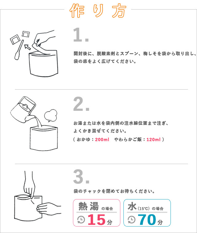 注ぐお湯の量で「おかゆ」「やわらかご飯」の2通りの食べ方が出来ます。