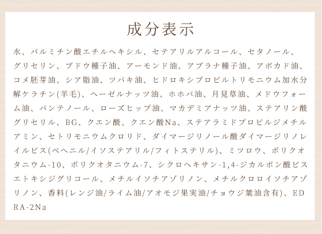 成分:水、パルミチン酸エチルヘキシル、セテアリルアルコール、セタノール、グリセリン、ブドウ種子油、アーモンド油、アブラナ種子油、アボカド油、コメ胚芽油、シア脂油、ツバキ油、ヒドロキシプロピルトリモニウム加水分解ケラチン(羊毛)、ヘーゼルナッツ油、ホホバ油、月見草油、メドウフォーム油、パンテノール、ローズヒップ油、マカデミアナッツ油、ステアリン酸グリセリル、BG、クエン酸、クエン酸Na、ステアラミドプロピルジメチルアミン、セトリモニウムクロリド、ダイマージリノール酸ダイマージリノレイルビス(ベヘニル/イソステアリル/フィトステリル)、ミツロウ、ポリクオタニウム-10、ポリクオタニウム-7、シクロヘキサン-1,4-ジカルボン酸ビスエトキシジグリコール、メチルイソチアゾリノン、メチルクロロイソチアゾリノン、香料(レンジ油/ライム油/アオモジ果実油/チョウジ葉油含有)、EDRA-2Na