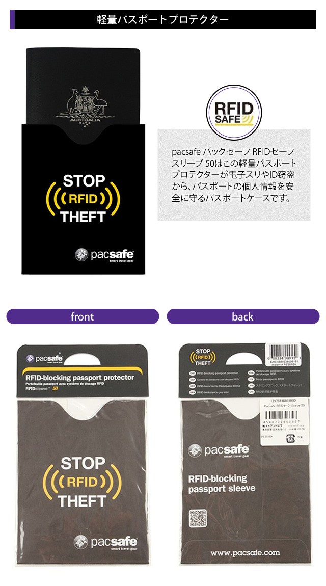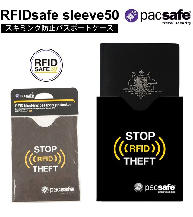 pacsafe パックセーフ RFIDセーフ スリーブ 50はこの軽量パスポートプロテクターは電子スリやID窃盗から、パスポートの個人情報を安全に守るパスポートケースです。