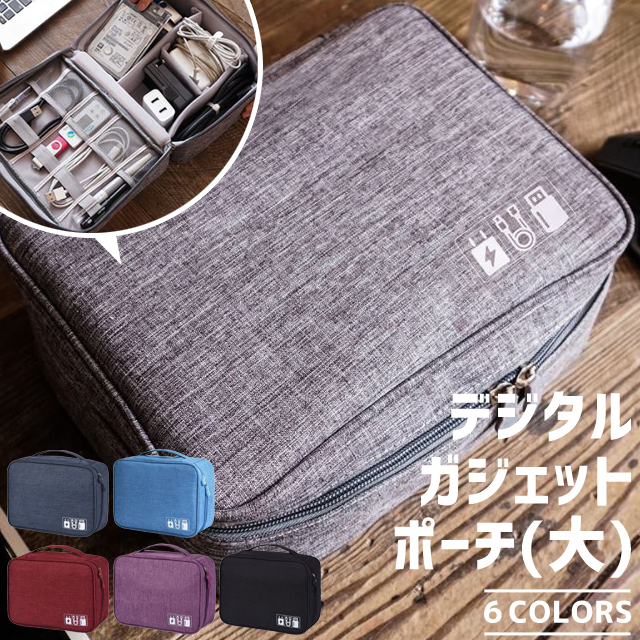 ごちゃごちゃとしがちなケーブル、USB、アダプタなどの小物類をまとめられるデジタルガジェットポーチ大です。