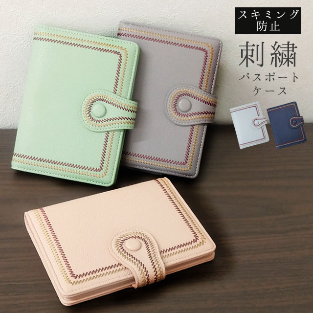 刺繍模様がおしゃれ *旅行用品/海外旅行/旅行グッズ/トラベルグッズ/便利グッズ/貴重品収納/レザー風/合皮/ボタン付き/ビジネス/淡色/出張/パスポート入れ/貴重品ケース/レザー調/男性/メンズ/レディース/女性/男女兼用/ユニセックス/ピンク/グリーン/緑/グレー/灰色/留め具付き/カード入れ/カードポケット/クレジットカード/キャッシュカード/ペンホルダー/海外出張/SIMカード/マルチケース/チケット/航空券/薄型/薄い/軽い/軽量/かわいい/おしゃれ/スキミング/スキミング対策/磁気防止/PUレザー/機能的*