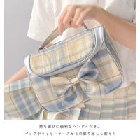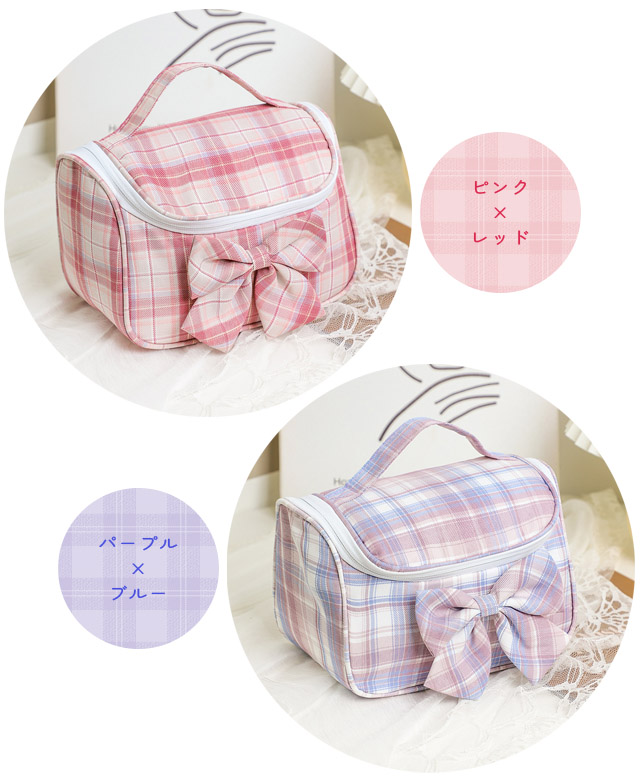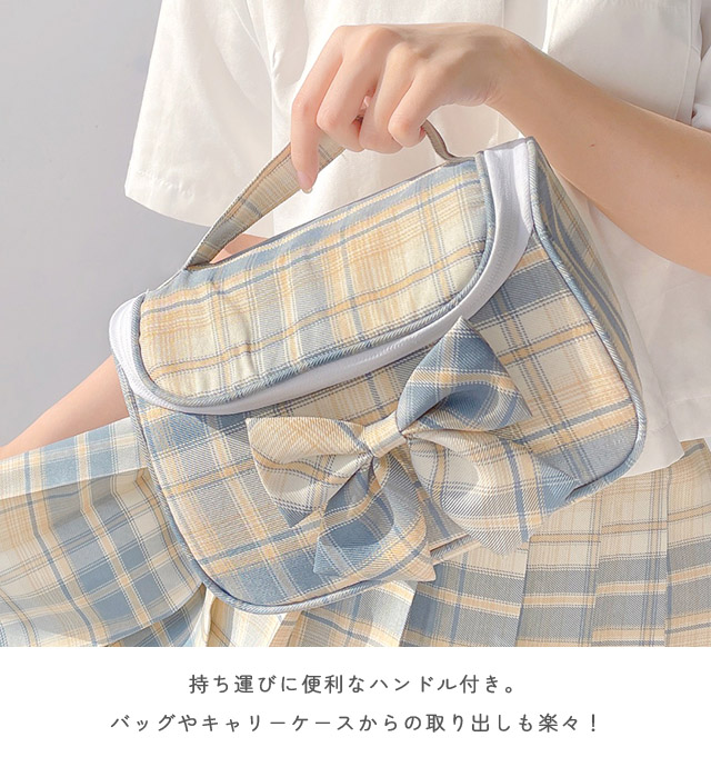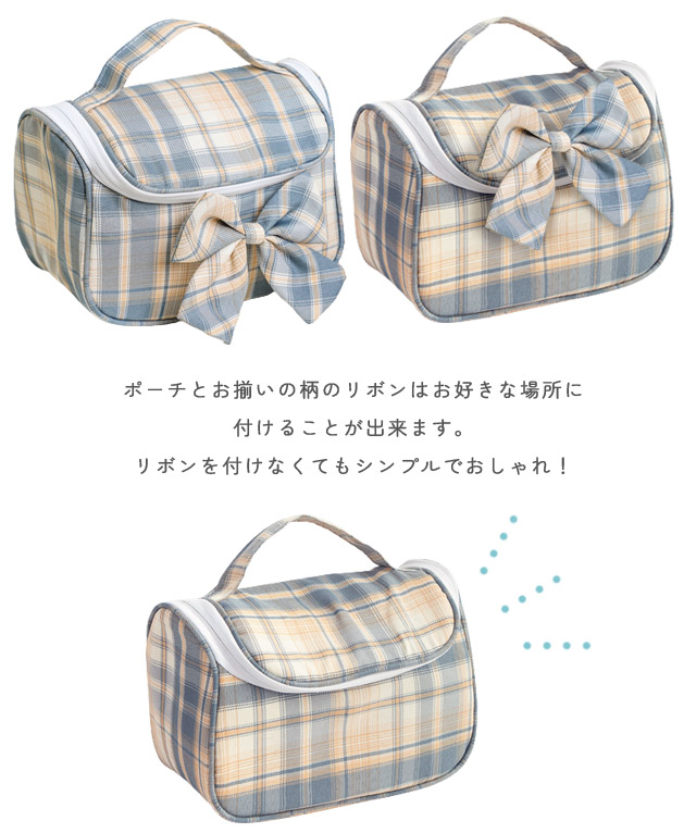 パステルカラーのチェックとリボン飾りでガーリーな雰囲気のコスメポーチ。