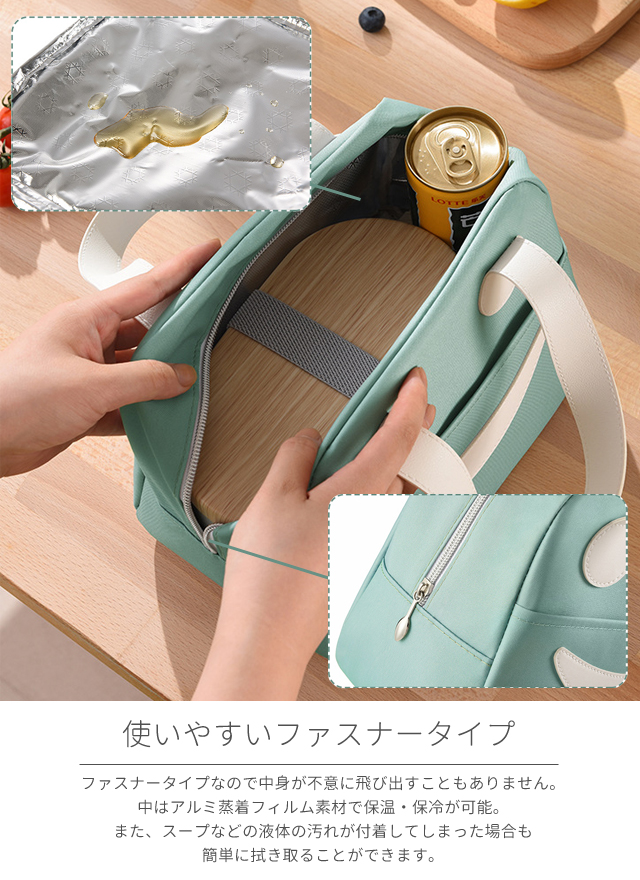 中はアルミ蒸着フィルム素材で保温・保冷が可能で、スープなどの液体汚れが付着してしまった場合も簡単に拭き取ることができます。