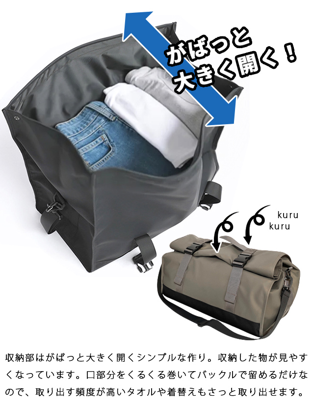 口部分をくるくる巻いてバックルで留めるだけのロールトップタイプ。