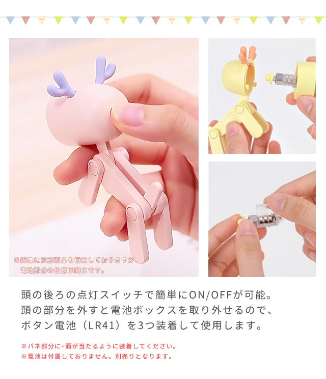 頭の部分を外すと電池ボックスを取り外せるので、ボタン電池(LR41)を3つ装着して使用します。