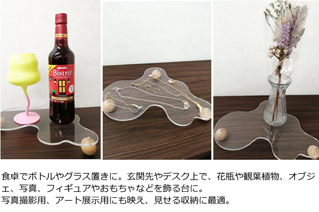 食卓でボトルやグラス置きに。玄関先やデスク上で、花瓶や観葉植物、オブジェ、写真、フィギュアやおもちゃなどを飾る台に。