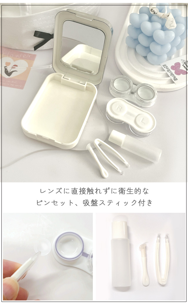 セット内容:鏡付き本体ケース、コンタクトケース2個、ピンセット、吸盤スティック、保存液容器