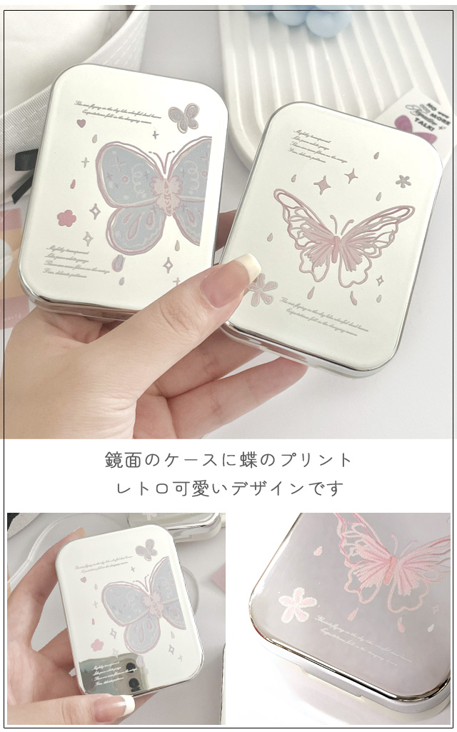 鏡面のケースに蝶のプリント。レトロ可愛いデザインです
