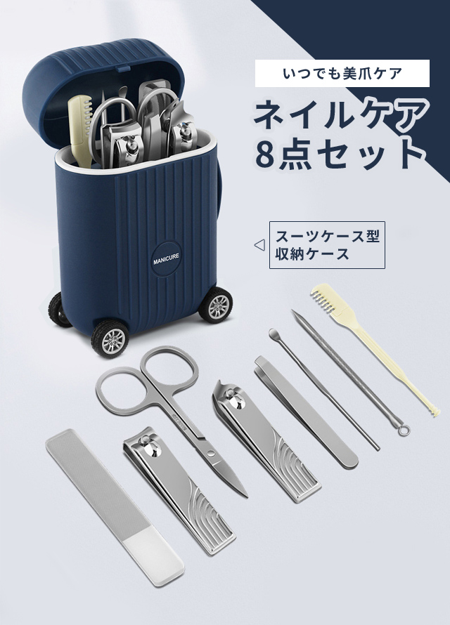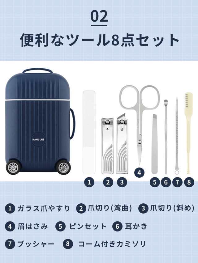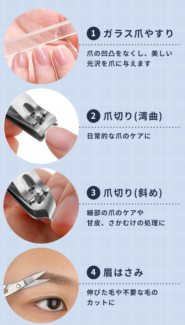 セット内容:爪切り(湾曲)×1、爪切り(斜め)×1、ガラス爪やすり、眉はさみ、ピンセット、耳かき、プッシャー、コーム付きカミソリ、収納ケース